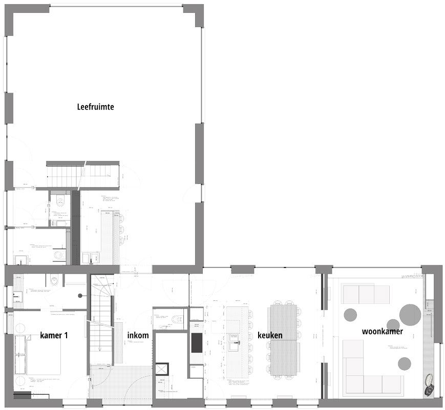 Tot 22 personen gezellig dineren en loungen in de leefruimte. Gezellig eten maken kan in de zeer ruime uitgeruste keuken.